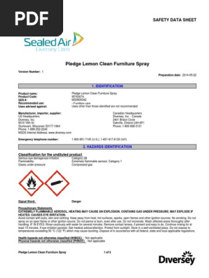 Up to 5 cash back PLEDGE FURNITURE SPRAY LEMON CLEAN Version 10 Print Date 03042015 Revision Date 02252015 SDS Number 350000027092 411 8. Up to 5 cash back MATERIAL SAFETY DATA SHEET Pledge Lemon Aerosol 1. Find a Pledge product to clean polish or renew your home. PLEDGE Lemon Clean Furniture Spray Aerosol HMIS NFPA Personal protective equipment Health 1 Flammability 3 Physical Hazard Instability 0 1 3 0 Version Number. PRODUCT AND COMPANY IDENTIFICATION Product information Trade name. MATERIAL SAFETY DATA SHEET PLEDGE - Lemon Aerosol 1. 3694028 94430 Recommended use. DL50 Calculado 2000 mgkg Efectos crónicos. Pledge Lemon Aerosol MSDS.