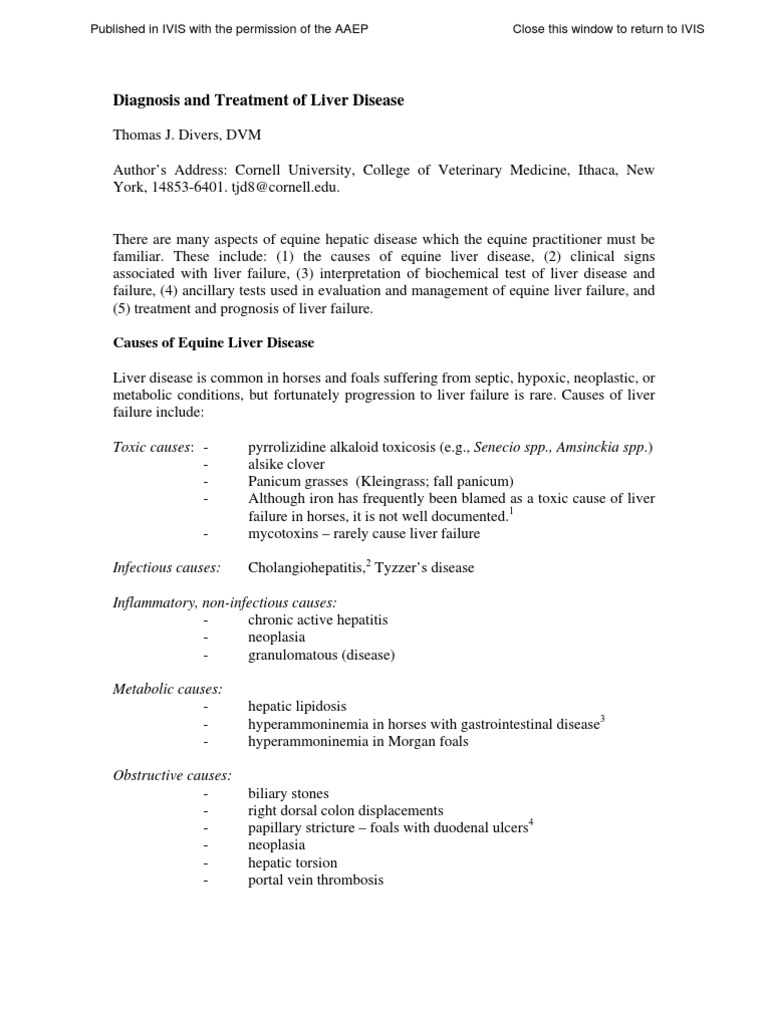 Tips for a right feeding for horses with a liver disease. Liver disease in the horse. This condition can cause the horse to lose weight and have other issues with the shedding of the coat. Horses can occasionally develop serious liver disease after treatment with products produced from horse blood such as plasma or tetanus antitoxin. Although liver disease is especially common in horses and foals progression to liver failure is not. When a horse has Cushings disease the liver can become enlarged and cause liver damage. Horses affected by this serum hepatitis exhibit acute liver failure signs such as blindness stumbling jaundiced mucus membranes and head pressing. 4 linhas Clinical signs of liver disease in the early stage are often vague and non-specific. Increases in serum hepatic enzymes and total bile acid concentration may indicate hepatic dysfunction insult disease or failure.