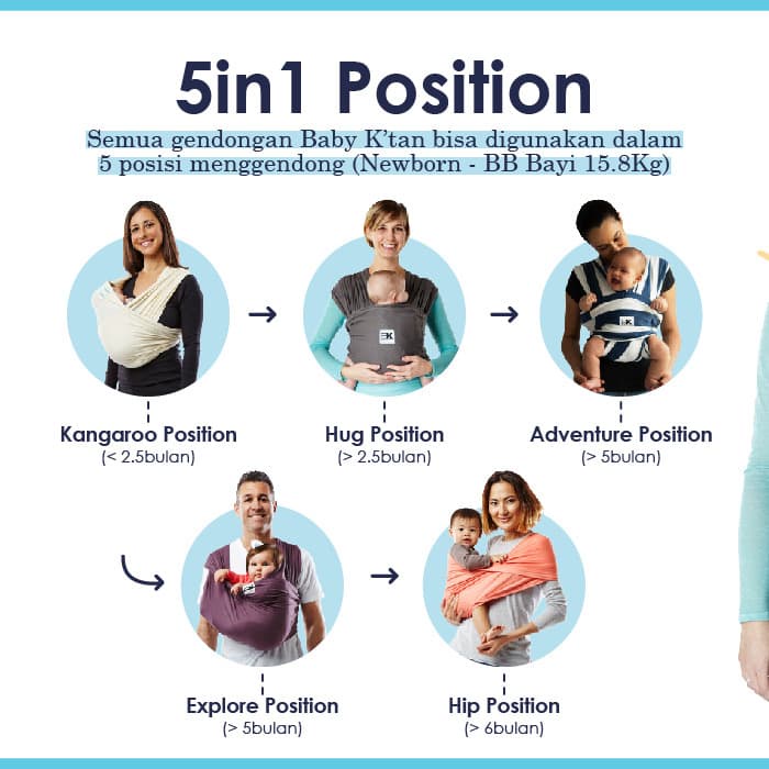 The Baby Ktan Original carrier is a wrap type carrier without the wrap design. Ktan has 6 different carry position and is made out of thin fabric that gives it extra breathability. Keep practicing and stay calmYour baby will let you know when heshe is ready to move out of the newborn Kangaroo Position by starting to stretch hisher legs and stand up in the fabric.