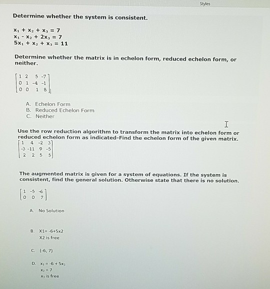 If a system has at least one solution it is said to be consistent. If a consistent system has an infinite number of solutions it is dependent. 2x 1 3x 2 5x 3 0-5x 1 6x 2-17x 3 0 7x 1 - 4x 2 3x 3 0 Without doing any row operations explain why this system is consistent. When you graph the equations both. When you graph the equations both equations represent the same line. When you try to solve the system you get an impossibility. A consistent linear system is a system of linear equations with at least one set of values satisfying all equations.