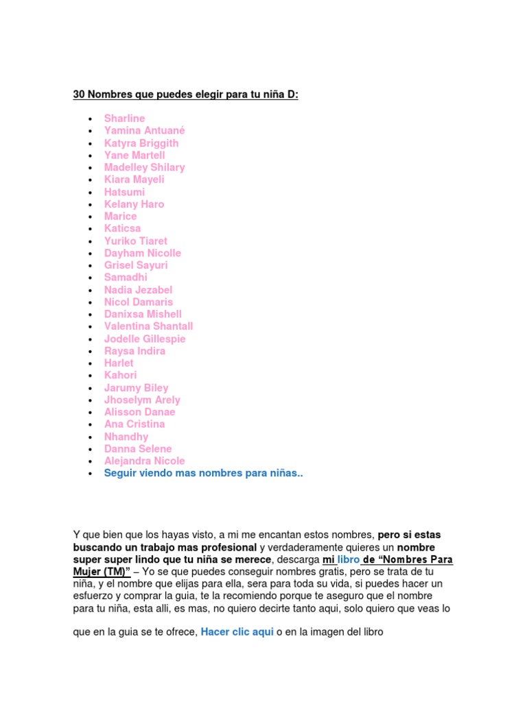 Comenzamos nuestro recorrido por el fascinante mundo de los nombres para tu bebé con 101 nombres de niña que empiezan por la letra A. Nombres para bebés de la A a la Z más de 5000 nombres 185 nombres japoneses de niña y niño para tu bebé y su significado 77 nombres celtas para niñas valientes guerreras y. Lista de nombres con D para niña. Nombres con D para niño. Nombres con letra D enero 9 2022 Resaltado por propiedades puras que resaltan un espíritu aventurero jovial y alegre el nombre de niña Deyanira cumple a cabalidad con los requerimientos mínimos de las madres modernas a la hora de nombrar a sus nuevas hijas. Es un nombre bíblico de niña muy usado que significa la mujer con alegría. Dasha es un nombre para niña de origen ruso derivado del griego Dorothy que significa regalo de Dios. Nombres de niña por la d Dayana. Descubre el significado y el origen de todos estos apodos inspirados en los personajes de las Sagradas Escrituras de la Biblia.